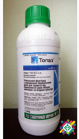 Проти мучнистої роси Топаз 100 EC, с.е. Діюча речовина - 100 г/л пенконазолу Хімічна група - Триазоли Форма випуску - Концентрат емульсії Упаковка: 1л - 61 дол., 5 л - 58 дол. за л. Переваги препарату: - Тривале дію - Системна дія, яка допомагає захистити всі частини рослини: швидке поглинання змен...