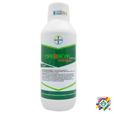 Мінімальна сума замовлення - 350 грн. Упаковка: 500 мл, 1 л. Діючі речовини: пропамокарб гідрохлорид - 530 г/л, фосетил алюмінію - 310 г/л. Препаративна форма: водорозчинний концентрат. Превікур Енерджі - фунгіцид повного системного дії з ростостимулюючими властивостями у вигляді водорозчинного конц...