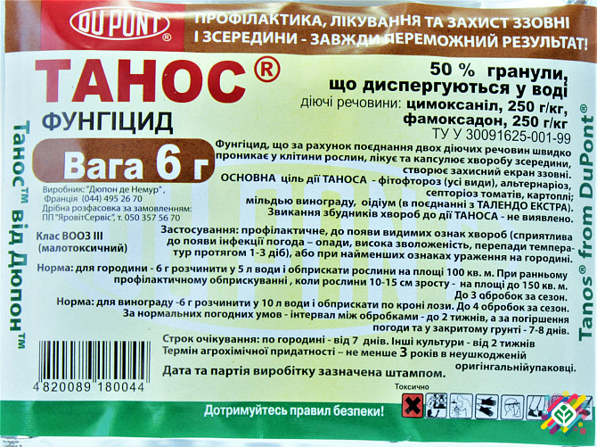 Мінімальна сума замовлення - 350 грн. Танос - високоефективний двокомпонентний фунгіцид лікувально-профілактичної дії. Призначений для захисту посадок картоплі, овочів, виноградників та соняшника. Діючі речовини - фамоксадон, цимоксанил. Фамоксадон - дуже потужна речовина для лікування рослин, за...
