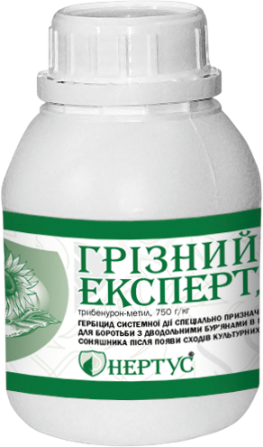 **Гербіцид системної дії "Грізний Експерт"** **Діюча речовина:** трибенурон-метил, 750 г/кг **Формуляція:** водорозчинні гранули **Виробник:** Петерс енд Бург КФТ, Угорщина **Тарна одиниця:** пляшка 250 г **Характеристика та переваги:** - Можливість боротьби з однорічними та багаторічними дводо...