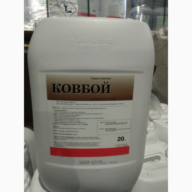 Гербіцид "Ковбой" - системний гербіцид неселективної дії на основі калійної солі гліфосату, призначений для знищення всіх видів бур'янів. Цей препарат є відмінним десикантом для зернових культур. Діюча речовина: гліфосат калійна сіль, у концентрації 441 г/л, що еквівалентно 360 г/л у кислотному екві...