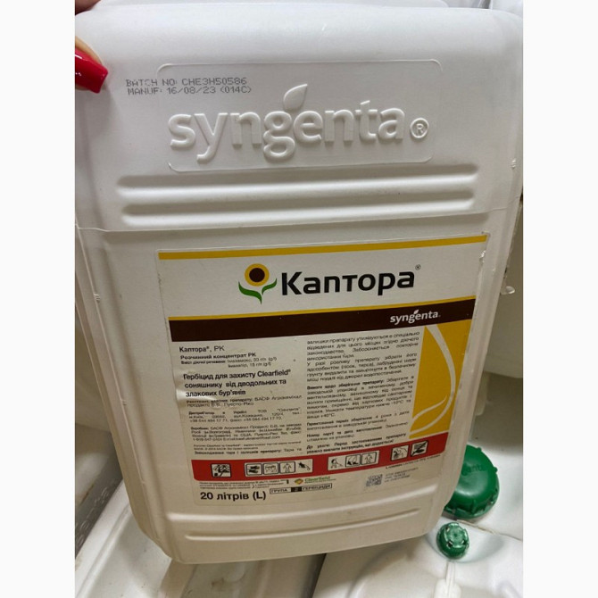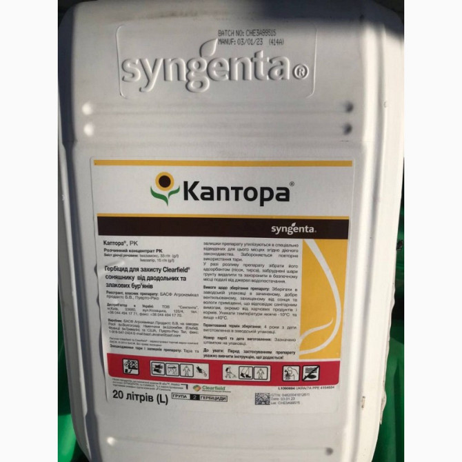 Каптора є ефективним гербіцидом для контролю бур'янів у посівах соняшнику Clearfield. Діюча речовина: 33 г/л імазамокс та 15 г/л імазапір. Культура: соняшник Clearfield. Бур'яни: однорічні дводольні та злакові. Тип застосування: післясходовий. Форма препарату: водний концентрат. Тара: 20 л, ціна вка...