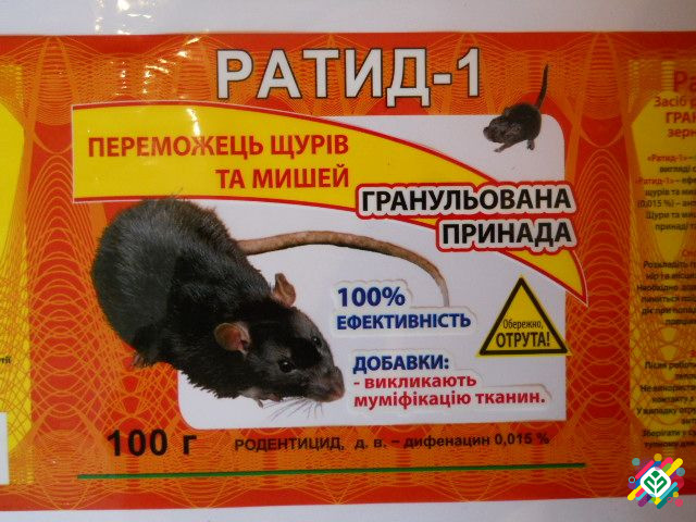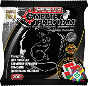 Родентицидне засіб у формі екструзійних гранульованих приманок з атрактантом, призначений для знищення крис та мишоподібних гризунів у приміщеннях, як житлових, так і нежитлових, а також на приділках. У склад приманки входить бродифакум у концентрації 0,005%, а також атрактанти та муміфікатори, які ...