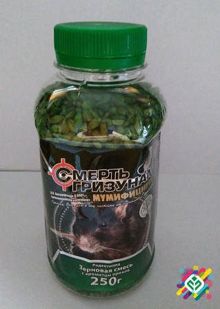 Родентицидне засіб із муміфікуючим ефектом представляє собою отруйну зернову суміш. Зернова приманка призначена для знищення щурів та мишоподібних гризунів у приміщеннях, як житлових, так і нежитлових, а також на ділянках біля будинків, у садах та городах. Основна діюча речовина — бромадіолон. У скл...