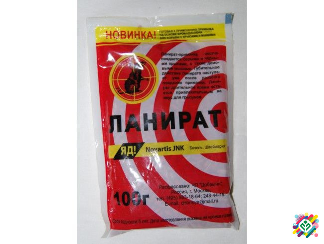 Приманка швидко споживається домашніми мишами, сірими та чорними польовими. Пагубна дія Ланирату настає вже після одноразового споживання зерна. **Діюча речовина:** бродифакум - 0.005% муміфікуючого агента. **Призначення:** Ланират має отруйну дію навіть на «стійких» до інших препаратів мишей і кр...