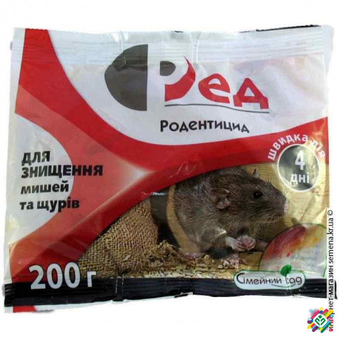 Рід - швидкодіючий та ефективний родентицид для знищення всіх видів шкідливих гризунів (сірих і чорних крис, домашніх і полевих мишей) в домашніх господарствах (будинки, підвали та ін.), на виробництвах та складах, на полях та сільськогосподарських угіддях. Діюча речовина: бродіфакум 0,005%. Засто...