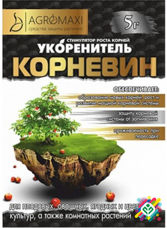 **Мінімальна сума замовлення 350 грн** **Корневин** використовується для укорінення саджанців плодових, ягідних, декоративних та квіткових культур, прискорення формування їх кореневої системи під час черенкування, покращення приживаності саджанців овочевих та квіткових культур під час пересадки. *...