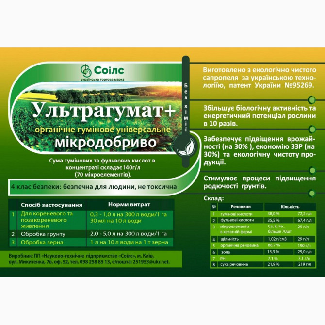 Органічне гумінове мікродобриво "УЛЬТРАГУМАТ+". Мікродобриво "Ультрагумат+" - стимулятор росту та розвитку рослин, патентована речовина, отримана на заводських умовах за допомогою передової технології: ультразвукової газоструйної акустичної кавітації в модулі синтезу гумінових речовин (завод органіч...