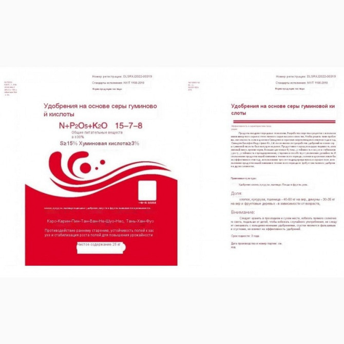 Доброго дня! Пропонуємо добриво на основі гумінової кислоти з Китаю з можливістю неперервних поставок. **Добриво на основі гумінової кислоти** Реєстраційний номер: DLSRXJ2022-00319 Виконавчий стандарт: NY/T 1106-2010 Форма випуску: Гранули N+P2O5+K2O 15-7-8 Загальна кількість поживних речовин >30% ...