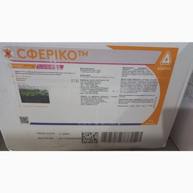 **Сферіко™** - системно-контактний фунгіцид для обробки насіння сої, призначений для боротьби з рядом грибкових захворювань. Містить у собі повноцінний баланс активних речовин: **Флудіоксоніл 25 г / л** та **Кіралаксіл 20 г / л**. - **Тип дії:** Фунгіцидний - **Виробник:** Адама - **Тарна одиниця:*...