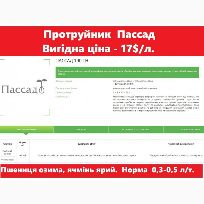 Пассад - це трьохкомпонентний системний протруйник для передпосівної обробки насіння зернових колосових культур. Діючі речовини: тебуконазол, 60 г/л + тіабендазол, 80 г/л + флутріафол 50 г/л. Механізм дії полягає в наступному: тебуконазол знищує інфекцію всередині насіння та захищає його від зовні...