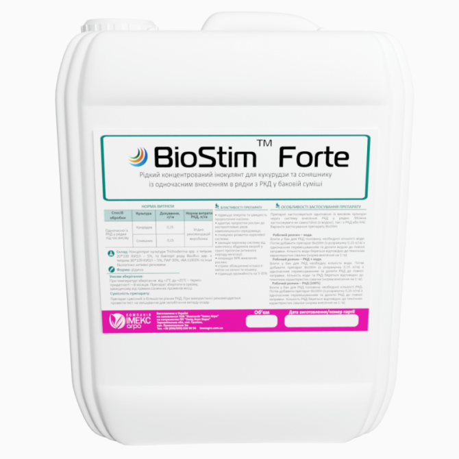 Інокулянт для кукурудзи BioStim™ - це сухий комплексний інокулянт для передпосівного обробітку насіння кукурудзи (в тому числі протруєного). Склад: Спеціалізовані для рослин кукурудзи азот фіксатори, фосфор- та калій мобілізатори, фітогормони ауксинового, гіберелінового і цитокінінового рядів, віт...