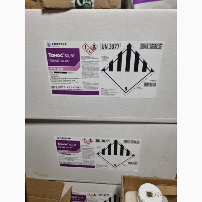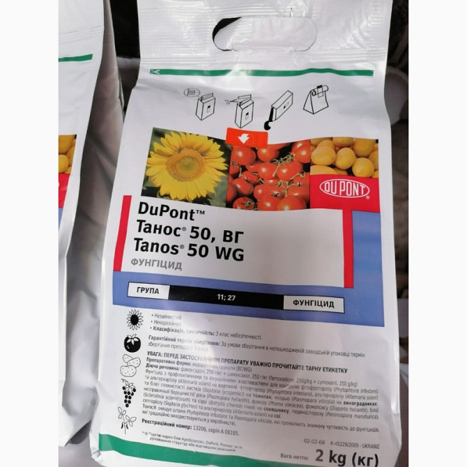 Танос® - Двокомпонентний фунгіцид профілактичної, лікувальної та антиспоруляційної дії для захисту від хвороб соняшнику, винограду, картоплі, томатів та цибулі. Діючі речовини: цимоксаніл – 250 г/кг, фамоксадон – 250 г/кг. Препаративна форма: водорозчинні гранули. Норма використання: 0,4 – 0,6 кг/...