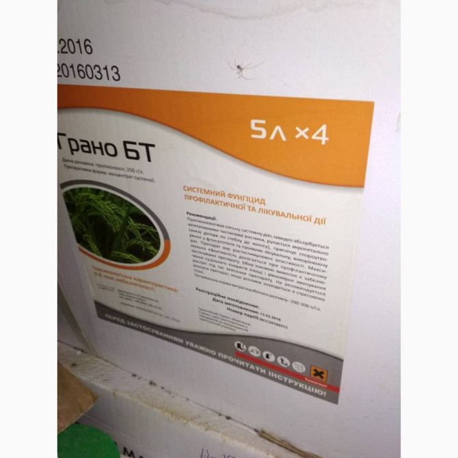 Грано, БТ - системний фунгіцид профілактичної та лікувальної дії. Упаковка: 5 літрів, ціна вказана за 1 літр. Діюча речовина: пропіконазол, 250 г/л. Препаративна форма: концентрат суспензії. Хімічна група: триазоли. Сумісність з іншими препаратами: в бакових сумішах фунгіцид сумісний з більшістю пе...