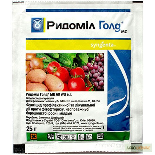 Фунгіцид Ридоміл Голд Виробник: "Сінгента", Швейцарія Ціни: - 25 г - 28.70 грн - 50 г - 53.20 грн Діюча речовина: манкоцеб + мефеноксам, у вмісті 640 + 40 г/кг. Препаративна форма: водно-дисперговані гранули. Ридоміл Голд – фунгіцид профілактичного та терапевтичного дії від фітофторозу, фальшив...