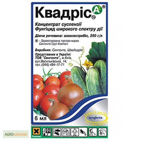 Фунгіцид Квадріс Виробник: "Сінгента", Швейцарія Ціна: 6 мл - 32,20 грн Діюча речовина: азаксистробін, 250 г/л Препаративна форма: концентрат суспензії Квадріс є системним фунгіцидом широкого спектра дії, який призначений для захисту овочевих культур від комплексу хвороб. Він належить до нового кла...