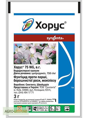 Фунгіцид Хорус75 WG Виробник: "Сингента", Швейцарія Ціна: 3 г - 34,10 грн. Фунгіцид системного дії проти парші, моніліозу та альтернаріозу насіннєвих, моніліозу кісточкових плодових культур, сірої та білої гнилі винограду. Переваги: - Високоефективний захист листя за будь-якої інфекційної наванта...