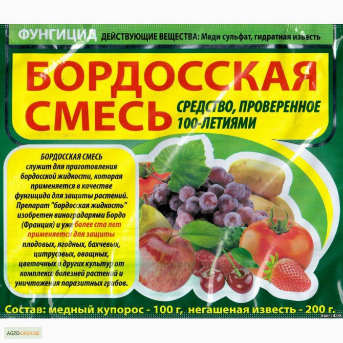 "Бордоска суміш" використовується для приготування бордоскої рідини, яка в свою чергу використовується для боротьби з різними хворобами (фітофтороз, коккомікоз, ржавчина, парша, кучерявість тощо) на різних рослинах. Ціна за 250 г - 24,00 грн. Бордоска суміш - це змішання вапна та сульфату міді у в...