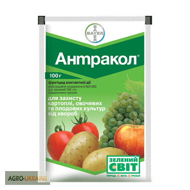 Фунгіцид Антракол Виробник: BAYER Ціна: 100 г - 86,20 грн Препаративна форма: змочувальний порошок. Фунгіцид контактної дії від грибкових захворювань, що відзначається високою ефективністю. Переваги: - Застосовується на різних культурах для боротьби з різними захворюваннями. - Відсутність резисте...