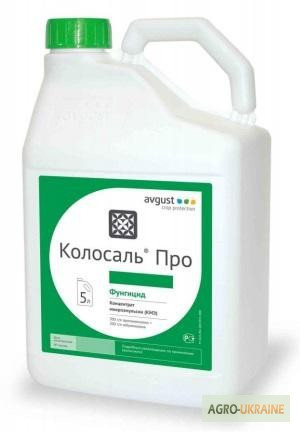 **Фунгіцид Колосаль Про** **Виробник:** Фірма "Август" **Препаративна форма:** концентрат масляної (нано) емульсії (КМЕ) **Діючі речовини:** пропіконазол + тебуконазол **Концентрація д.в.:** 300 + 200 г/л **Хімічний клас діючої речовини:** триазоли **Упаковка:** каністра 5л **Опис:** К...