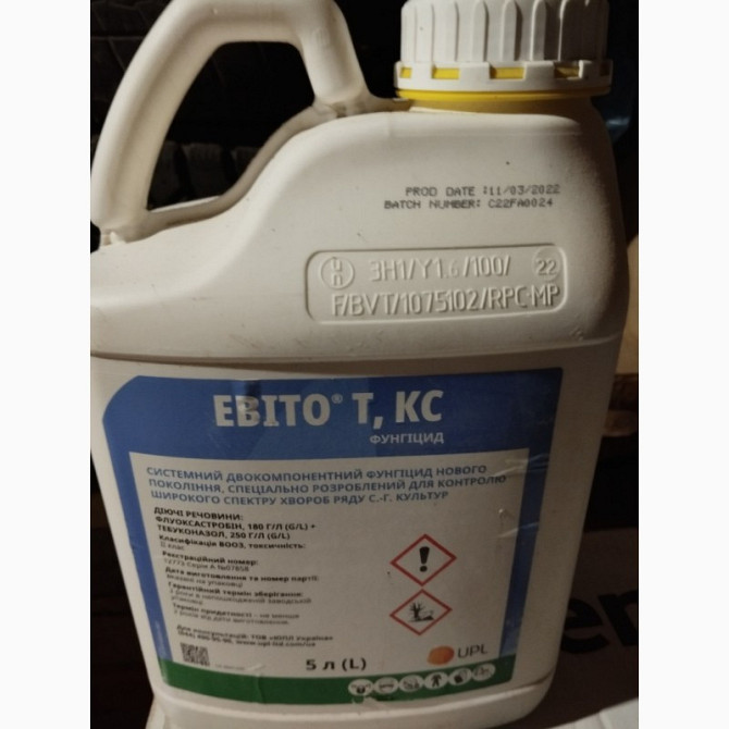 **Евіто® Т - Системний фунгіцид нового покоління** **Опис продукту:** Евіто® Т - це двокомпонентний фунгіцид, який має функцію підсилення фізіологічних процесів рослин. Діючі речовини: флуоксастробін (180 г/л) та тебуконазол (250 г/л). Препарат поставляється у формі концентрату суспензії в каністра...