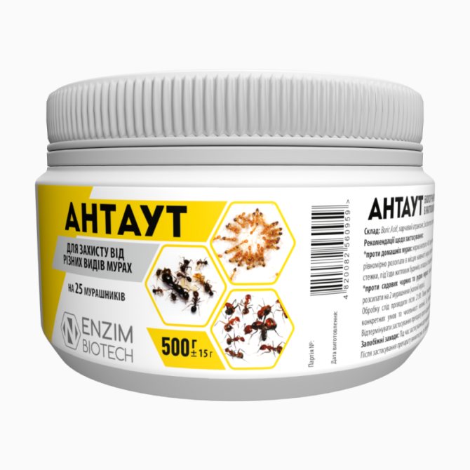 Антаут - біологічний препарат-приманка для боротьби та захисту від чорних, рудих садових та домашніх мурах, призначений для використання в житлових, виробничих, складських та інших приміщеннях, на ділянках з великою кількістю мурах. Склад препарату: Борна кислота, приваблювач для їжі, Saccharomyce...