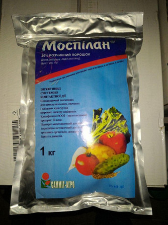 Опис: Інсектицид, аналог Моспілану, на основі ацетаміприду, у концентрації 200 г/кг; призначений для обробки пшениці, ріпаку, сої, люцерни, соняшнику, буряка, яблунь та картоплі. Характеристики: - Системний інсектицид контактно-шлункової дії для ефективного контролю широкого спектру шкідників на рі...