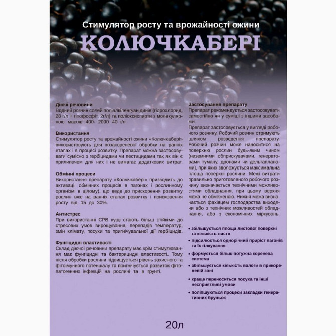Стимулятор росту та врожайності ожини "Колючкабері" Діючі речовини: Водний розчин солей поліалкіленгуанідинів (гідрохлорид, 28 г/л + гіпофосфіт, 2 г/л) та поліоксиспирти з молекулярною масою 400-2000 40 г/л. Використання: Стимулятор росту та врожайності ожини "Колючкабері" призначений для позакоре...