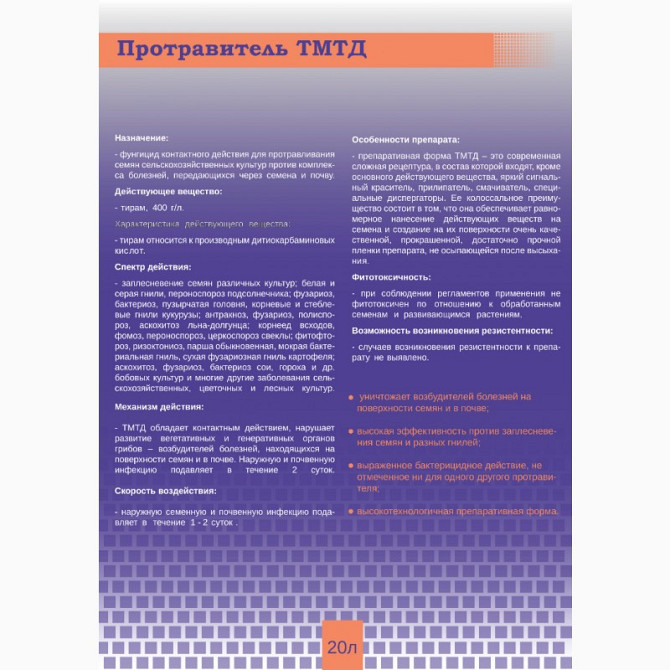 Протравитель ТМТД Виробник: Sunny Joint Контактний фунгіцидний протравник для насіння різних сільськогосподарських культур. Протравник з фунгіцидною та бактерицидною дією. Інструкція з використання: Переваги: - знищує збудників хвороб на поверхні насіння та в ґрунті; - висока ефективність проти плі...