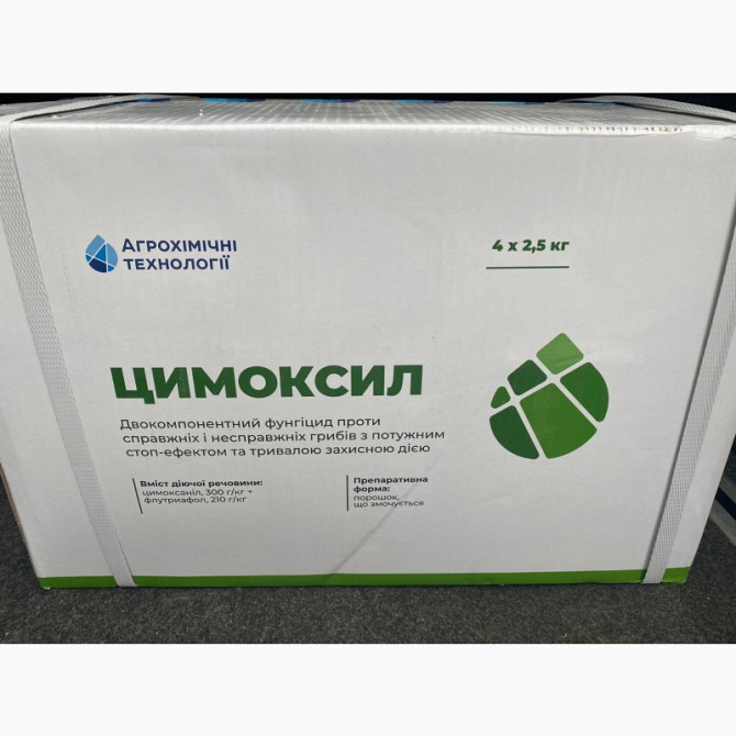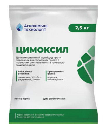 Фунгіцид Цимоксил є двокомпонентним препаратом з потужним стоп-ефектом та тривалим захисним ефектом. Діючі речовини: цимоксанил (300г/кг) + флутиафол (210г/кг). Приготування: порошок, змочується. Діє на справжні та несправжні гриби в культурах соняшнику та сої. Виробник: Агрохімічні технології. Уп...