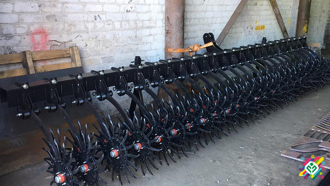 Ротаційна борона мотузкова "Агро клевер": Технічні характеристики: - Ширина захоплення: 6 метрів - Суцільний брус: 140x140x6 мм - Відстань між колесами: 100 мм - Колеса на закритих підшипниках (2 шт. на одному колесі) - Зуб виготовлений за американським аналогом, з повністю повтореною геометрією і м...