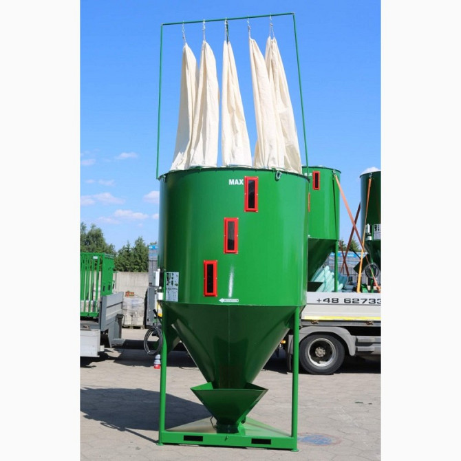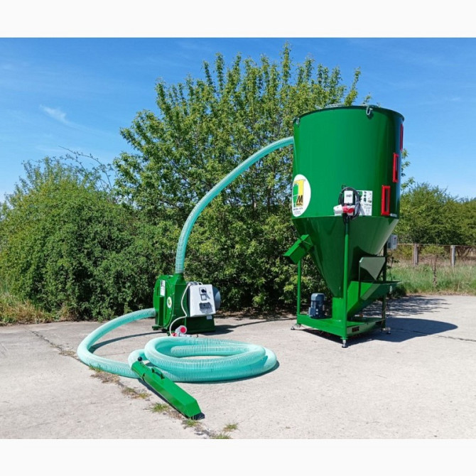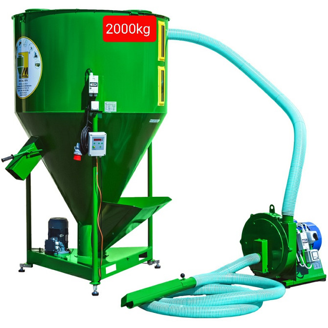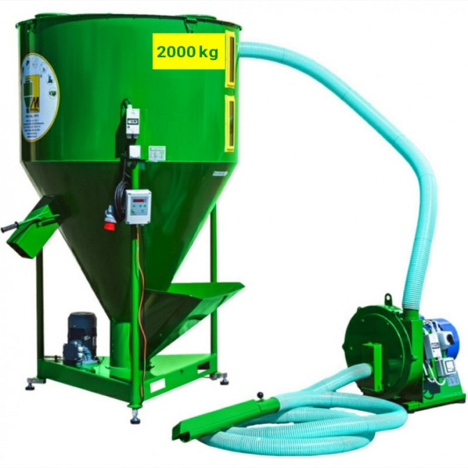 Комбікормовий міні-завод для виробництва збалансованого корму для великої рогатої худоби, свиней, птиці та інших сільськогосподарських тварин Комбікормовий міні-завод, що складається з зернодробарки, змішувача сипучого корму, вагового дозатора з пам'яттю на 10 рецептів, шлангу ПВХ, металевої насадк...